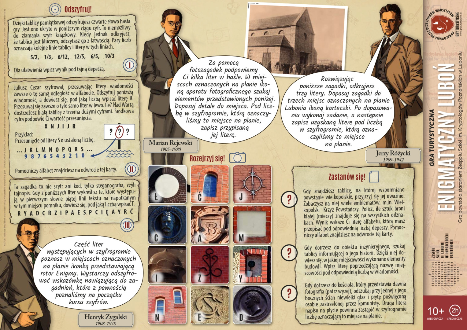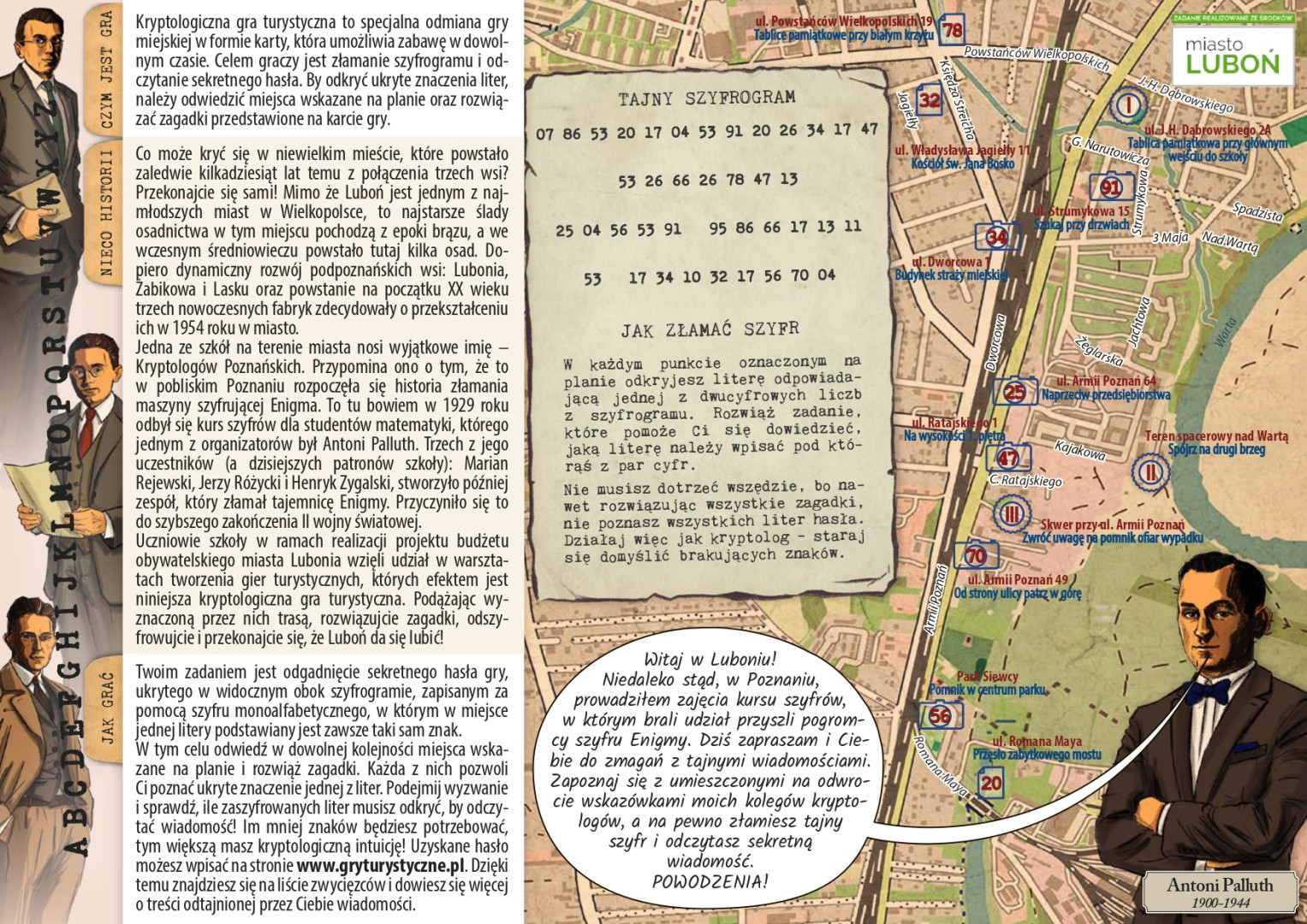 Gra nawiązuje do historycznych lat trzydziestych XX wieku, kiedy to z inicjatywy kpt. M. Ciężkiego zorganizowano kurs kryptologii dla najzdolniejszych studentów. Jednym z wykładowców był inżynier A. Palluth. Najlepszymi  z kursantów okazali się matematycy, którzy rozpoczęli pracę w filii Biura Szyfrów i z czasem złamali kod Enigmy. To patroni szkoły ZS w Luboniu- Poznańscy Kryptolodzy.
